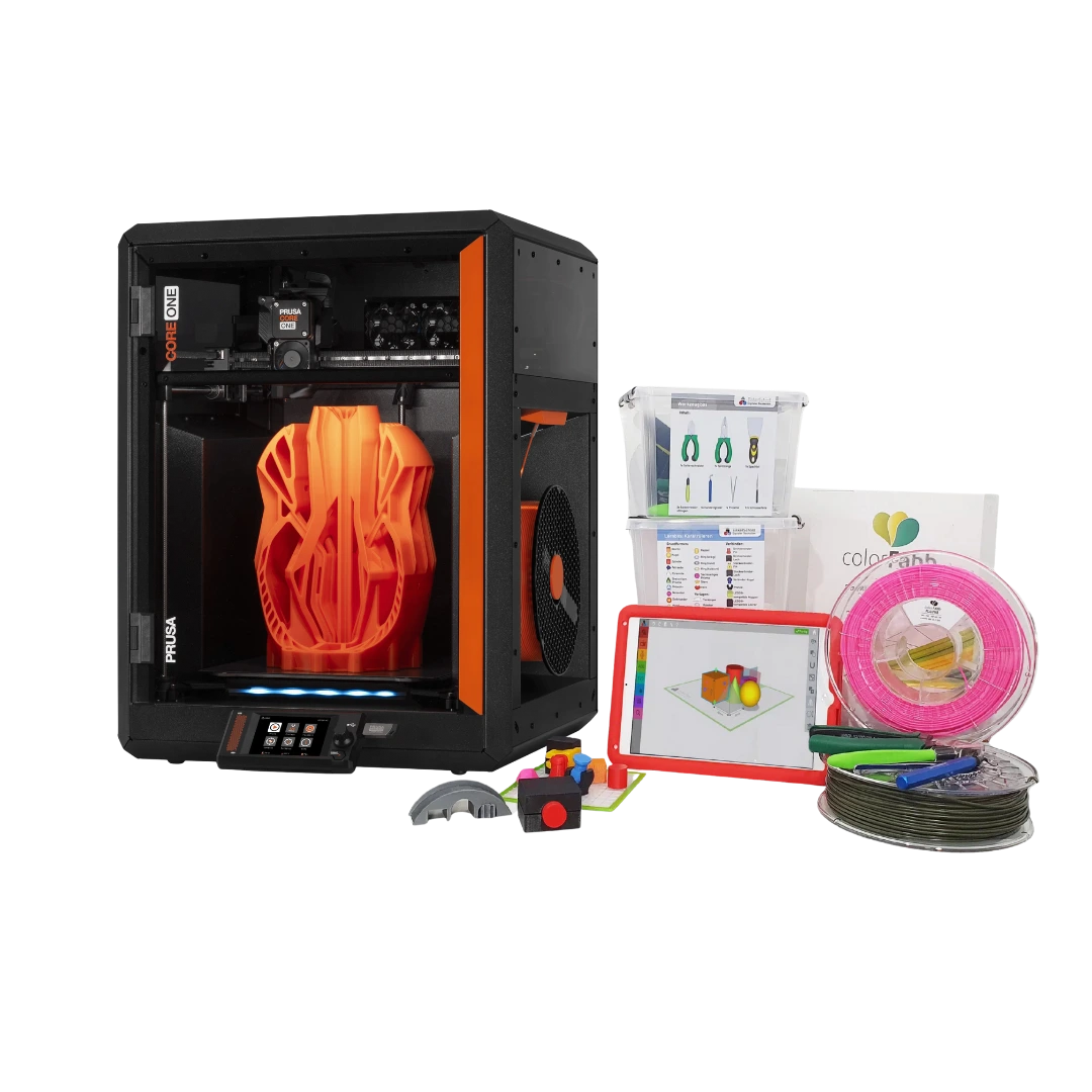 Mit dem TinkerSchool Prusa CORE One+ Komplettpaket erhältst du alles, was du für den Start in die Welt der 3D-Konstruktion und des 3D-Drucks in der Schule benötigst in Kombination mit einem Hochleistungs-3D-Drucker.